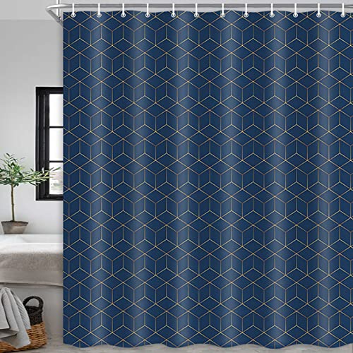 JAWO Hotel Quality Navy Blue Shower Curtain, Blue and Gold Geometric Pattern Fabric Shower Curtains Set, Modern Boho Chic Bathroom Accessories 69X70 Inches