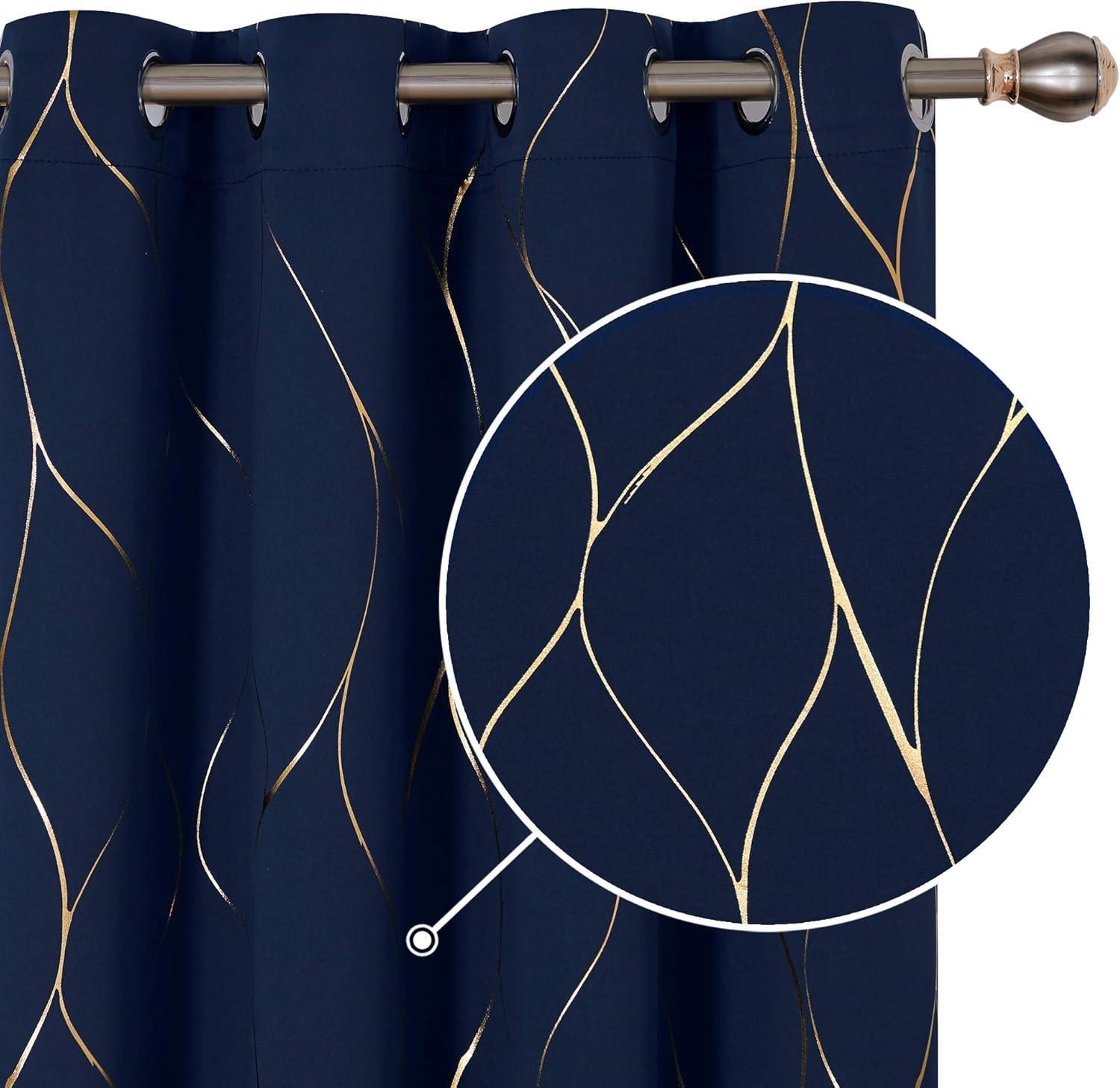 Deconovo Eyelet Thermal Insulated Blackout Curtains, Gold Wave Foil Printed Curtains for Bedroom, 52 x 54 Inch (Width x Length), Navy Blue, One Pair