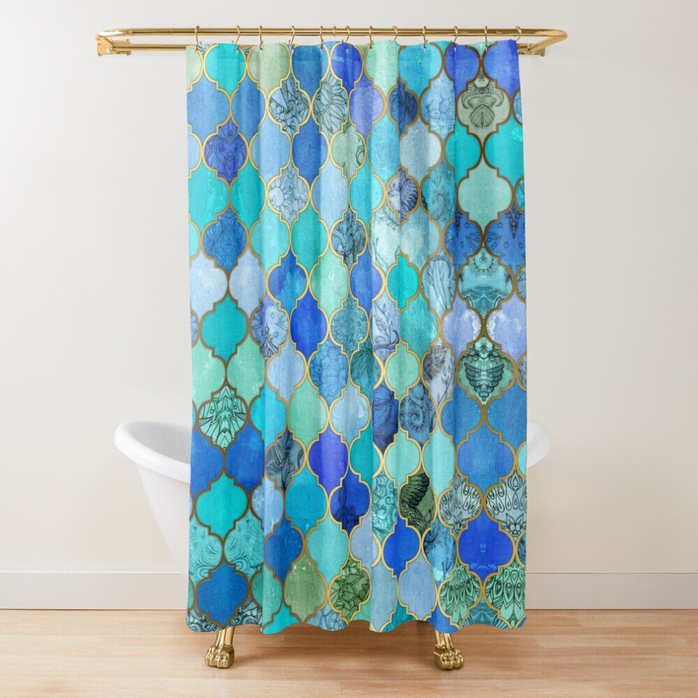 Shower Curtains Cobalt Blue, Aqua Gold Decorative Moroccan Tile Pattern for Bathroom Decor 72x72 inches