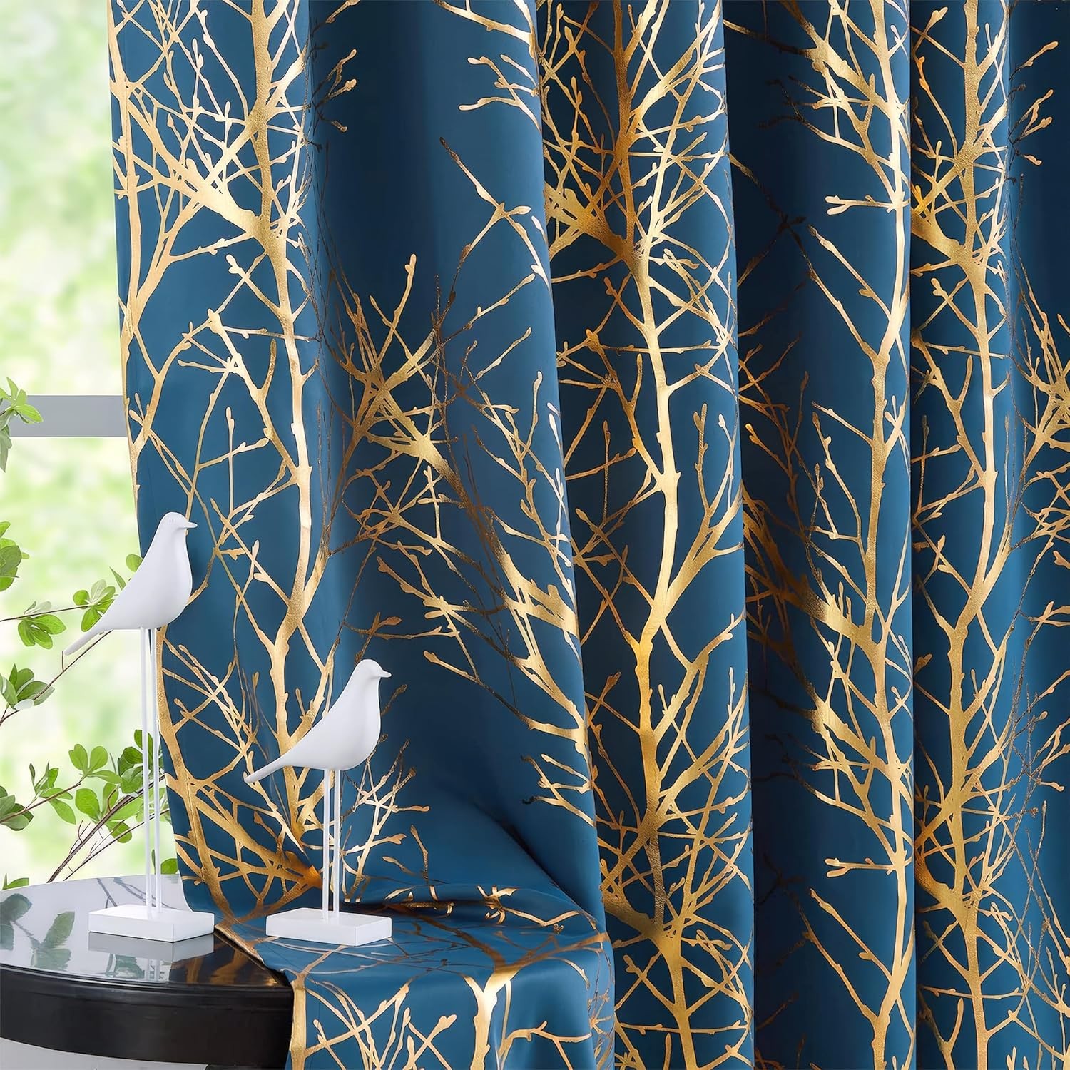 Sutuo Home Navy Blue Sheer Curtains 84 Inches Long 2 Panels Set, Gold Foil Print Metallic Bronzing Branch, Privacy Voile Window Treatment Decor Drape Pair for Bedroom Living Room 52" W x 84" L