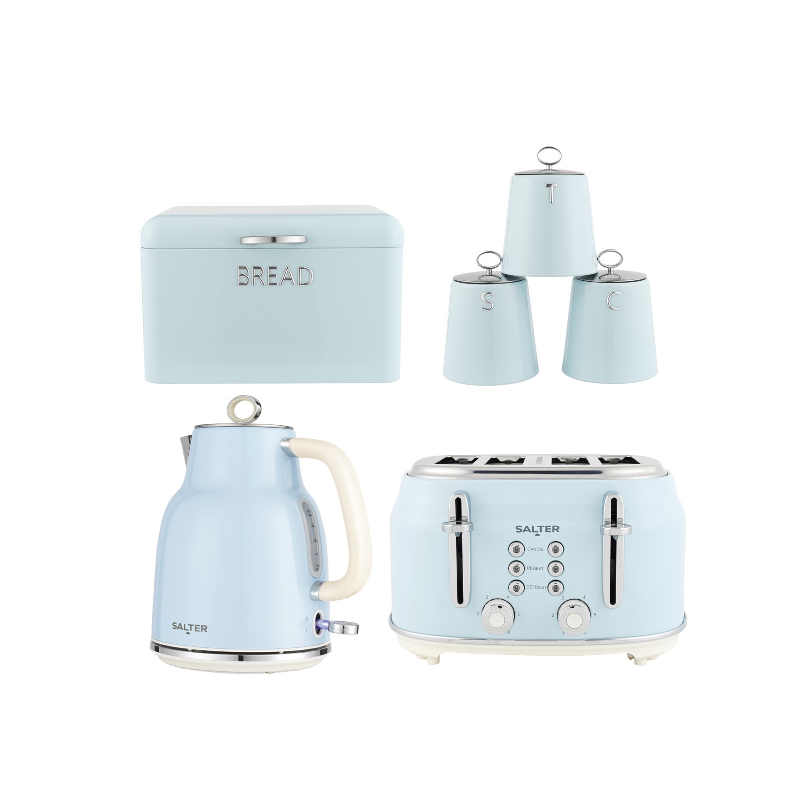 Salter Retro Kettle, Toaster, Canister and Bread Bin Set 4 Slice Wide Slots Blue