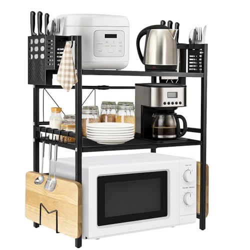 BLUE BAZAAR Expandable Microwave Oven Rack, 3Tier Kitchen Countertop Over Microwave Stand Shelf Unit, Kitchen Worktop Organiser for Air Fryer, Space Saving Standing Baker's Racks