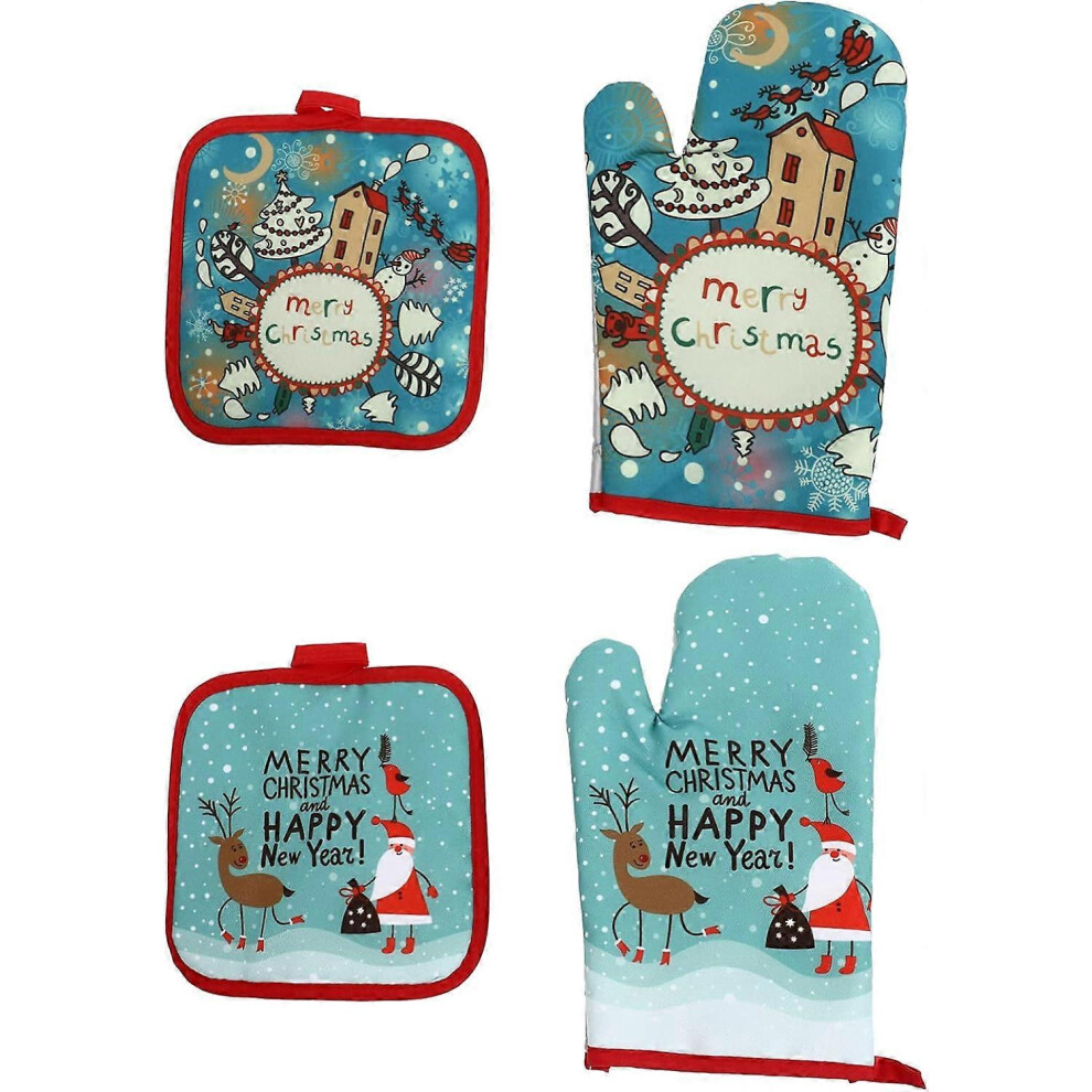 Christmas Oven Mitt Pot Holder: Heat Resistant Christmas Microwave Mitt Hot Pad Cooking Baking Kitchen Utensils (Blue) (4Pcs)