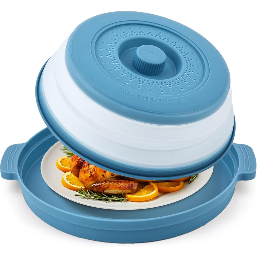 10.5" Collapsible Microwave Splatter Cover & Base Mat, Vented Plastic/Silicone Lid, Plate Holder & Colander (Blue) â Compatible with Microwaves