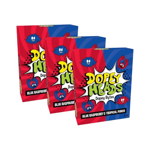 Dopey Heads | Dopey Bytes | HALAL | Crunchy Bytes | Blue Raspberry | Tropical | Tiny Candy | Pack of 3 | Weight 40g (1.41 oz) Each - Blue Raspberry & Tropical