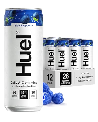 Huel Daily A-Z Vitamins Energy Drink, 12 x 330ml Cans, Blue Raspberry Sparkling Multivitamin Energy Drink, Fizzy Drinks Made with Real Fruit, Rich in Electrolytes, Low Calorie, Caffeine Boost