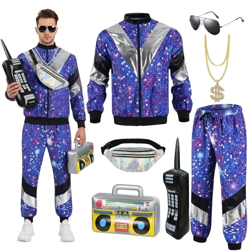 Xerteam 80s 90s Fancy Dress Men with Accessories, Retro 80s 90s Hip Hop Outfit for Adults, 80s Fancy Dress Set with Sportswear Shirt Pant Glasses Necklace Balloon Radio Waist Bag - Starlight Blue