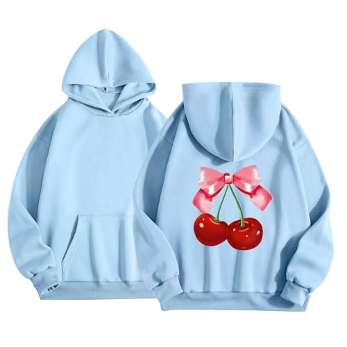 Girls Hoodie for Kids Long Sleeve T Shirts Jumper Warm School Sweatshirt Teen Girls Cherry Bow Print Pullover Top Regular Fit Sportswear with Pockets Fall Winter Clothes Age (Sky Blue, 12-13 Years)