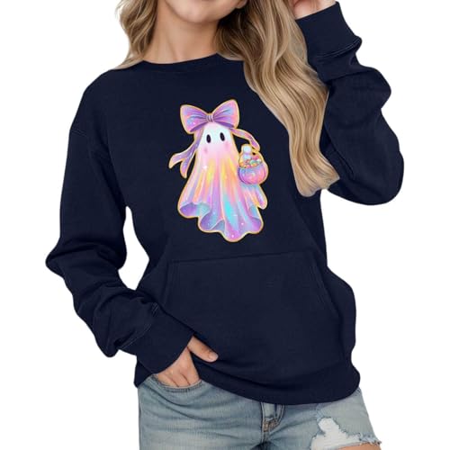 Girls Halloween Sweatshirt Crewneck School Pullover Sweatshirts Casual Sweater Cute Ghost Print Teen Girls Lightweight Long Sleeve Shirts Jumper Tops with Pocket Clothes (Dark Blue, 9-10 Years)