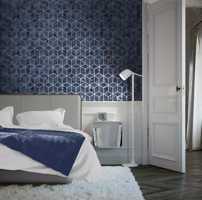 GEOMETRIC BLUE SILVER WALLPAPER QUALITY DESIGNER MURIVA ELIXIR CUBE 166512