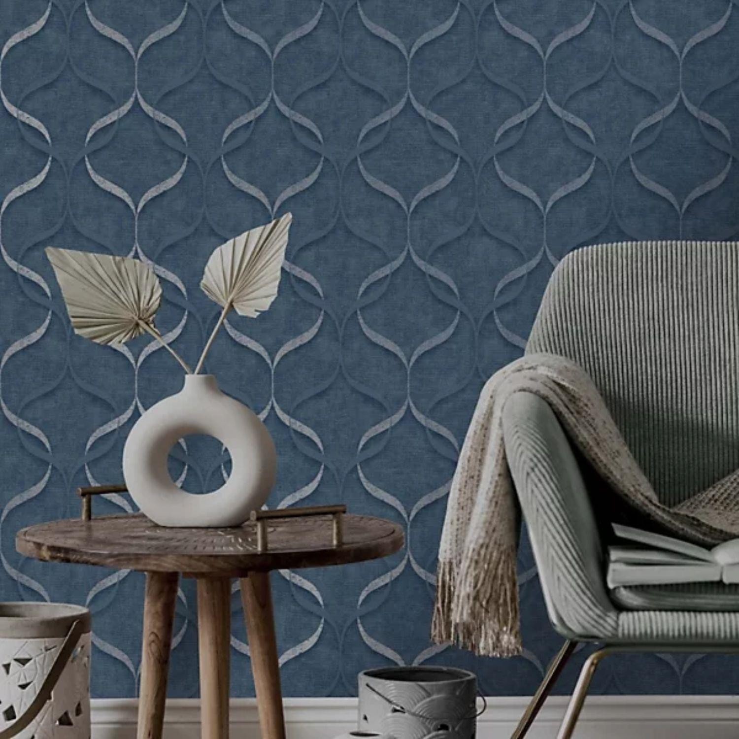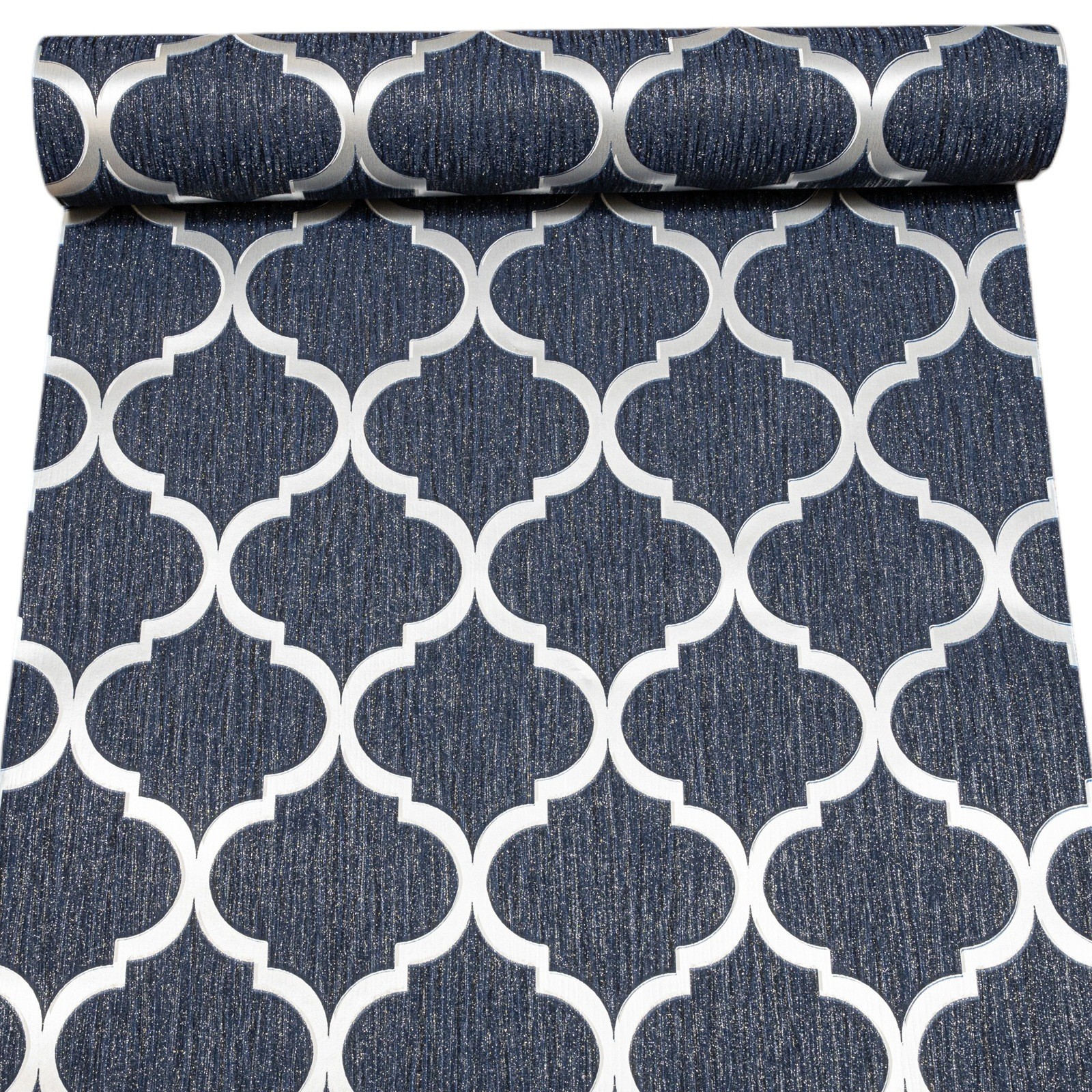 Navy Blue Wallpaper Trellis Geometric Metallic Textured Silver Feature Wall New