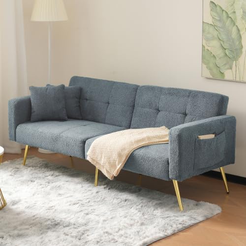 Goldicoo Blue Sherpa Convertible Sofa Bed with Gold Legs, 3 Adjustable Backrest Angles, Side Storage Pockets, High-Density Foam, 176 x 75 x 64 cm