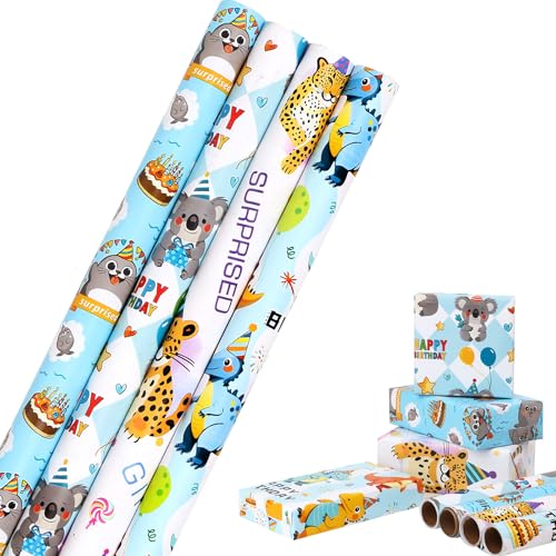 HBell Animal Birthday Wrapping Paper,4Rolls Animal Gift Wrapping Paper,43cm x 3m Kids Wrap paper for Boys Girls Birthday Gift Wrap (Blue)