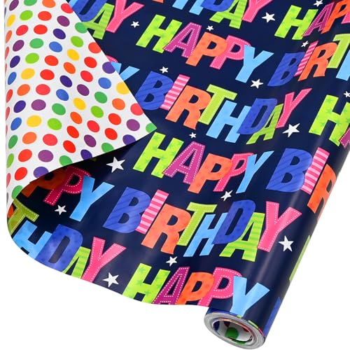 ADQUATOR 10m×43cm Roll of Blue Happy Birthday Wrapping Paper, 100% Recyclable ECO Double-Sided Gift Wrap for Birthday Present Party Decorations