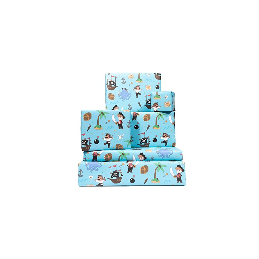 - Pirate Gift Wrap - 6 Sheets of Cool Wrapping Paper for Kids - Pirates Treasure Ship Island - For Boys Girls - Son Nephew Grandson - Blue -