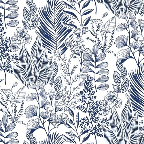 Fiula Self Adhesive Wallpaper 41CMx10M Peel and Stick Wallpaper Botanical Vinyl Wrap for Furnitur Blue White Floral Removable Waterproof Sticky Back Contact Paper for Cabinet Wall Bedroom Leavese