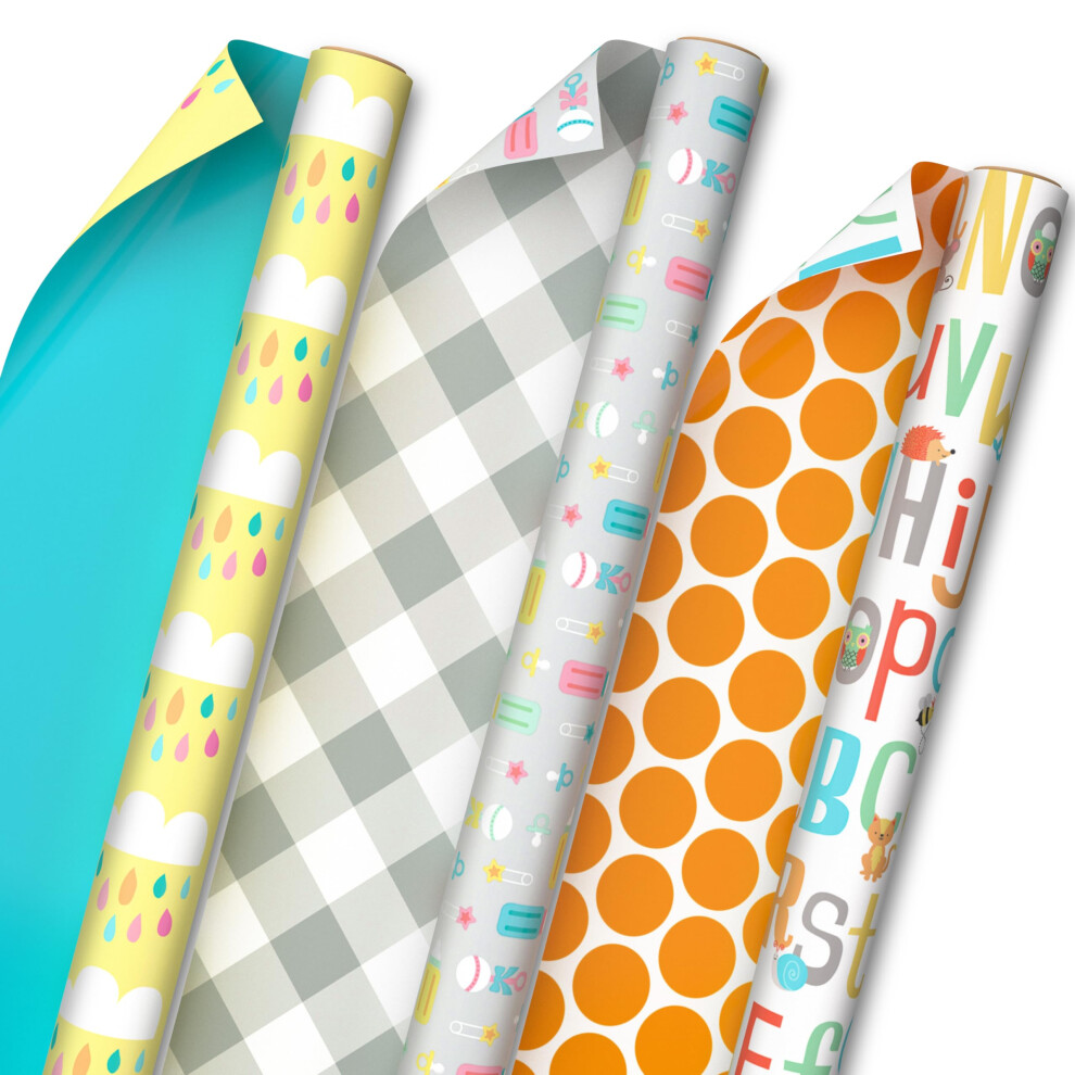 Hallmark Baby Shower Wrapping Paper Rolls - Pastel Gift Wrap Paper - Gender Neutral Clouds ABCs Bottles Polka Dots Blue Gray Gingham (Set of 3 Ro
