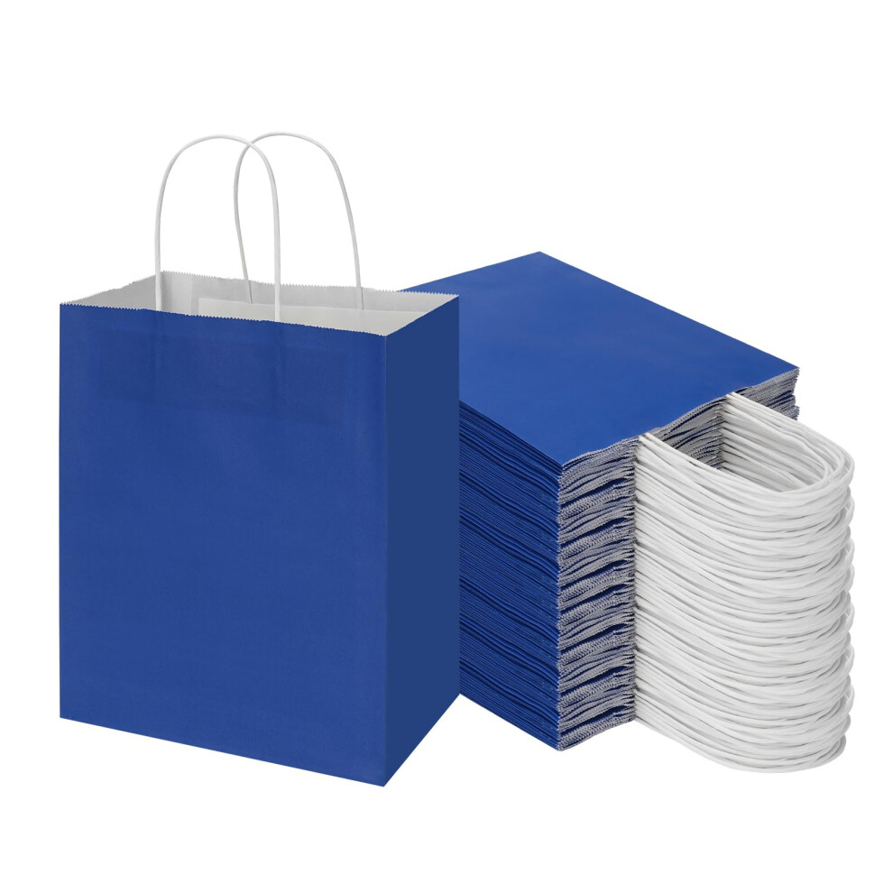 Toovip 100 Pack 8x4.75x10 Inch Medium Royal Blue Kraft Paper Bags with Handles Bulk Gift Wrap Bags for Favor Grocery Retail Party Birthday Shopping B