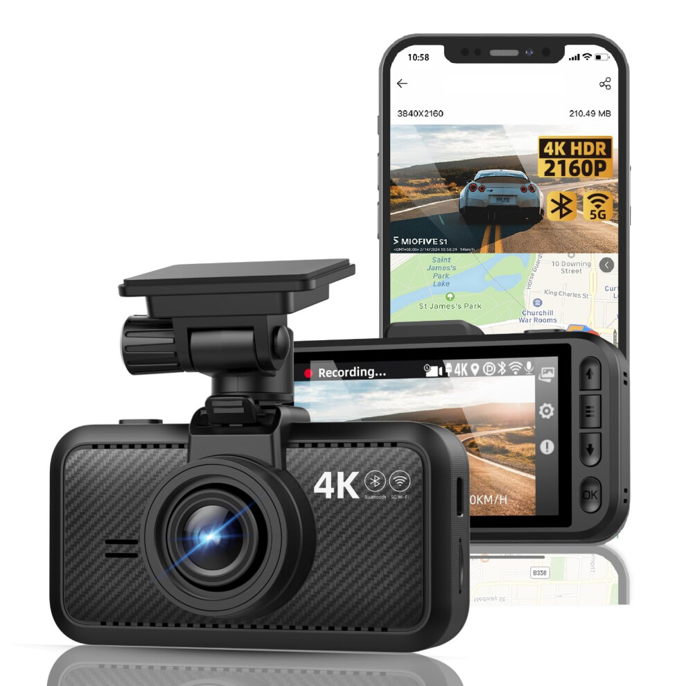 Miofive Car Camera 4K Resolution, 5G WiFi & Bluetooth, GPS Dash Cam, 3" IPS Screen, G-sensor, Night Vision, Loop Recording, HDR, App Control, and Sup