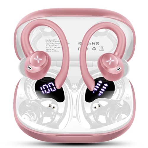 Wireless Earbuds Sport, Bluetooth 5.4 Headphones with 50H Deep Bass Stereo, Wireless Earphones with Earhooks 4 Noise Cancelling Mic, Bluetooth Earbuds IP7 Waterproof, LED Display for Running/Gym Rose