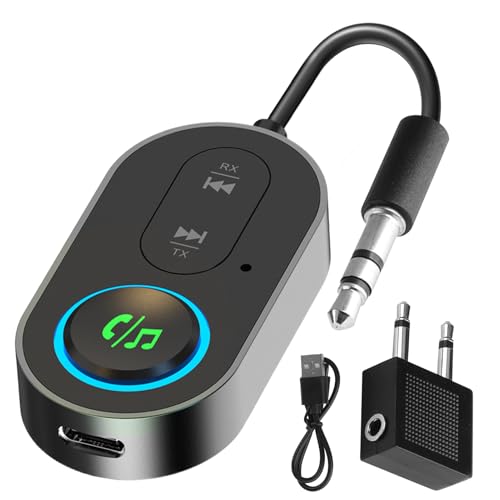 Airplane Bluetooth 5.3 Adapter Transmitter Receiver, Dual Pairing Wireless Car Bluetooth Adapter Compatible with 2 AirPods or Headphones, 3.5mm AUX Jack Audio Transmitter for TV, Planes, Speaker