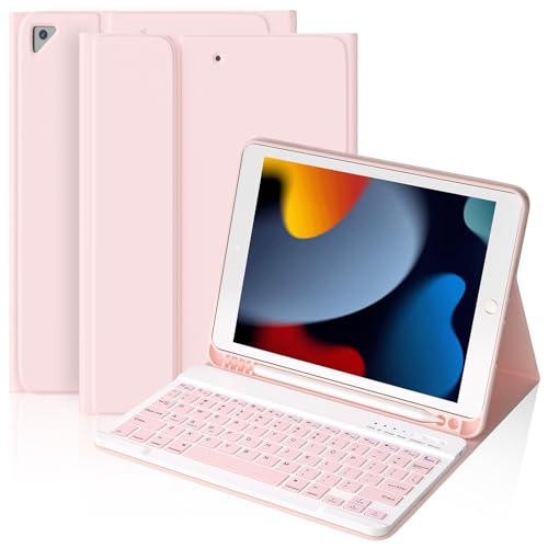 GKABXY Keyboard Case for iPad 9th/8th/7th Generation 10.2 inch 2021/2020/2019, Soft TPU Back Cover with Pen Holder, Magnetically Detachable Wireless Bluetooth Keyboard, Auto Wake/Sleep, Pink