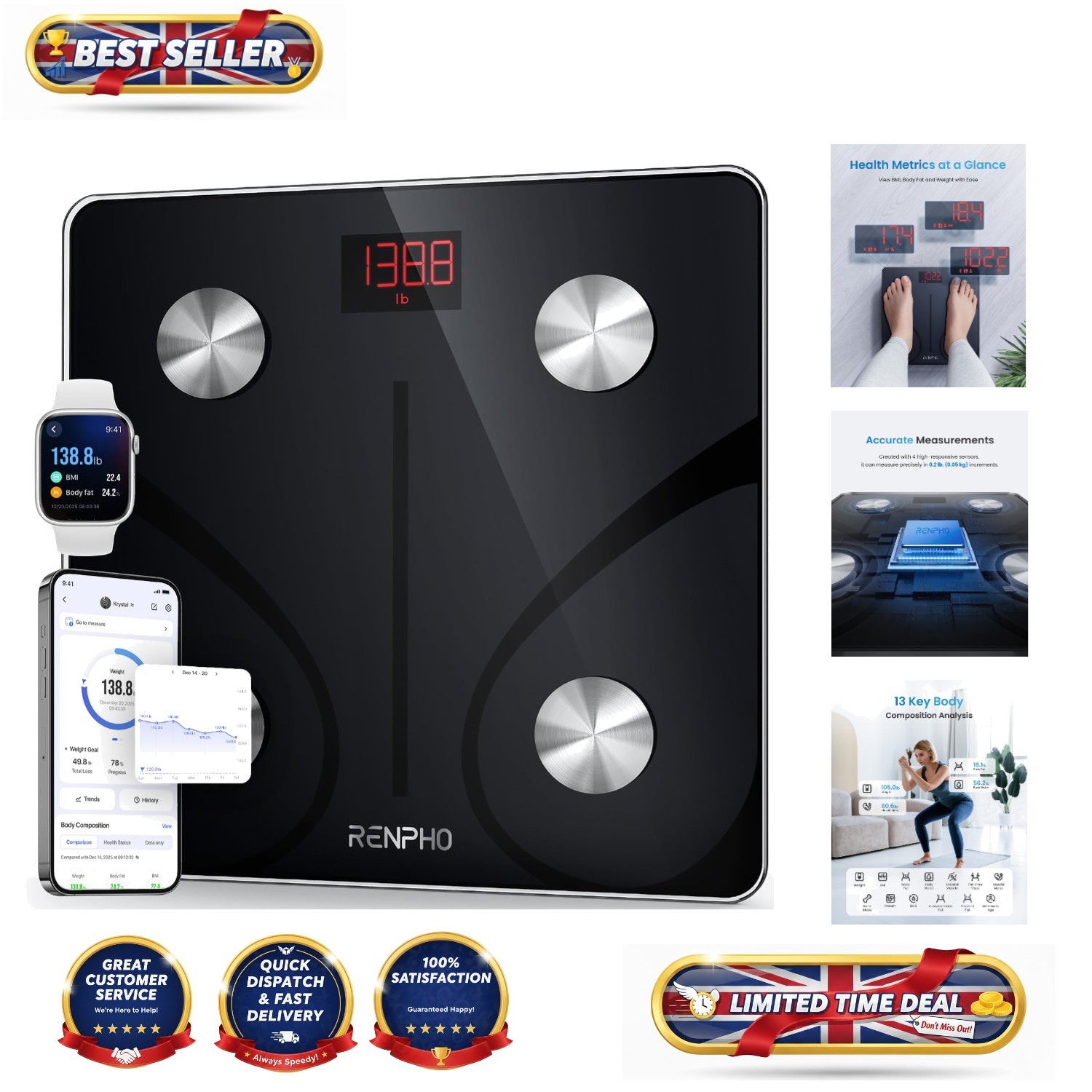 RENPHO Smart Bluetooth Body Fat Scale with App for BMI, Muscle Mass, Weight Trac