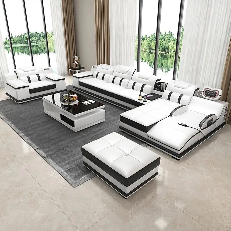 Linlamlim Italian Genuine Leather Sectional Sofa with Bluetooth, Speaker, Functional Headrest, Massage Chaise | Big Corner Couch