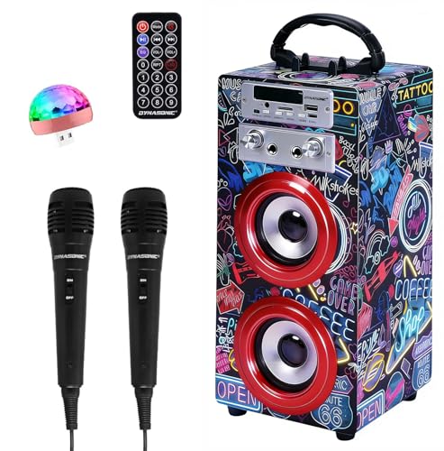 DYNASONIC Karaoke Machine with 2 Microphones, Portable Bluetooth Speaker with Lights, USB and SD Reader, Gift for Children Ages 5-13 (Model 17)
