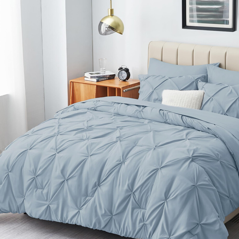 HIMEET Blue Comforter Set Queen 7 Pieces Light Blue Comforter Pintuck Bluey Bedding Set Pinch Pleat Design Blue Queen Comforter Set