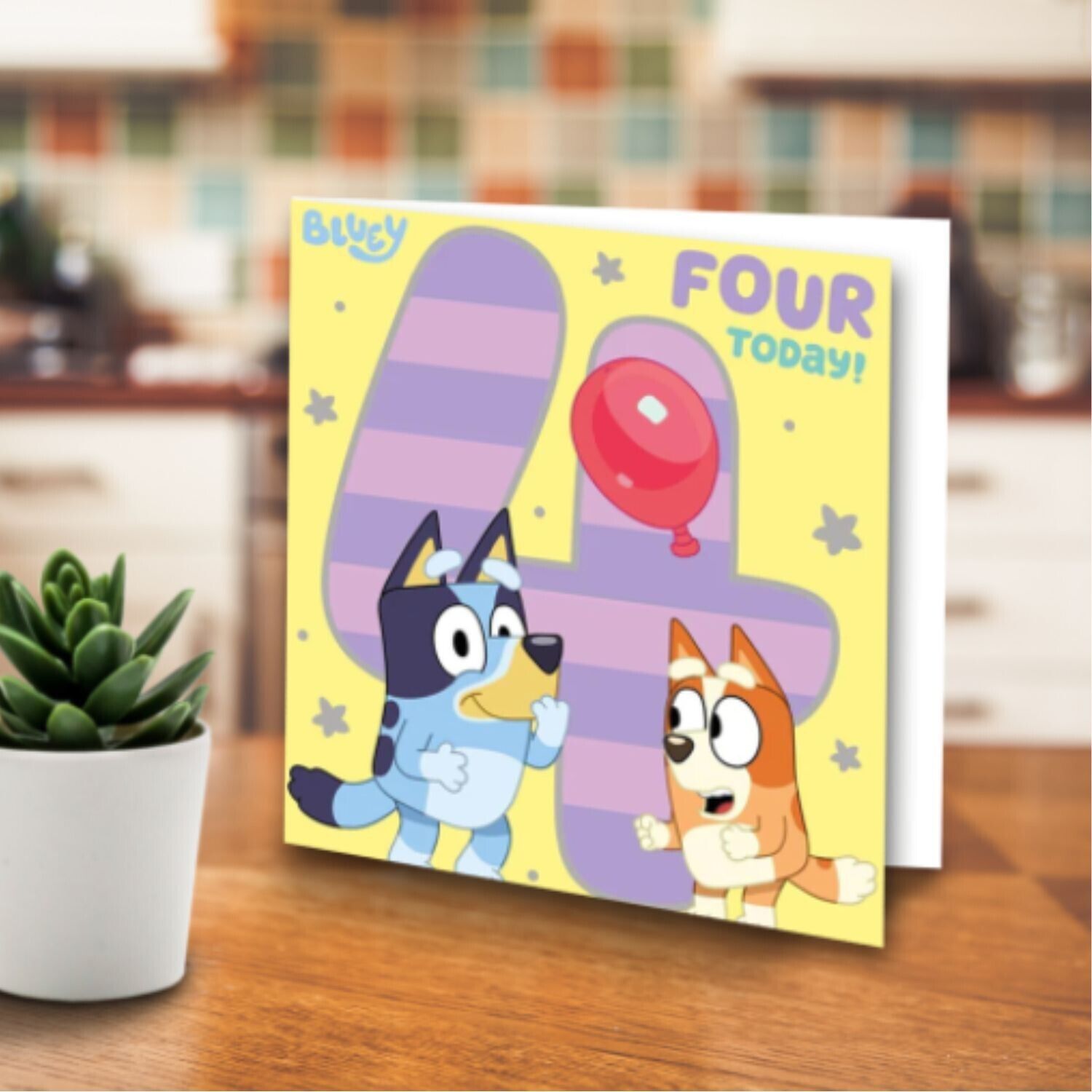 4th Birthday Card Bluey Age 4 " 4 Today, WOOHOO" with Envelope, FSC Approved
