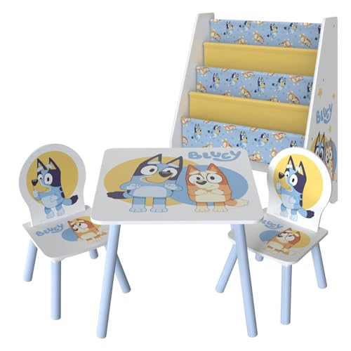 Bluey Kids Table & Chairs Set with Wooden Bookshelf Bundle – Activity Table with 2 Chairs & Front-Facing Book Storage Rack – Official Furniture Set for Bedroom & Playroom