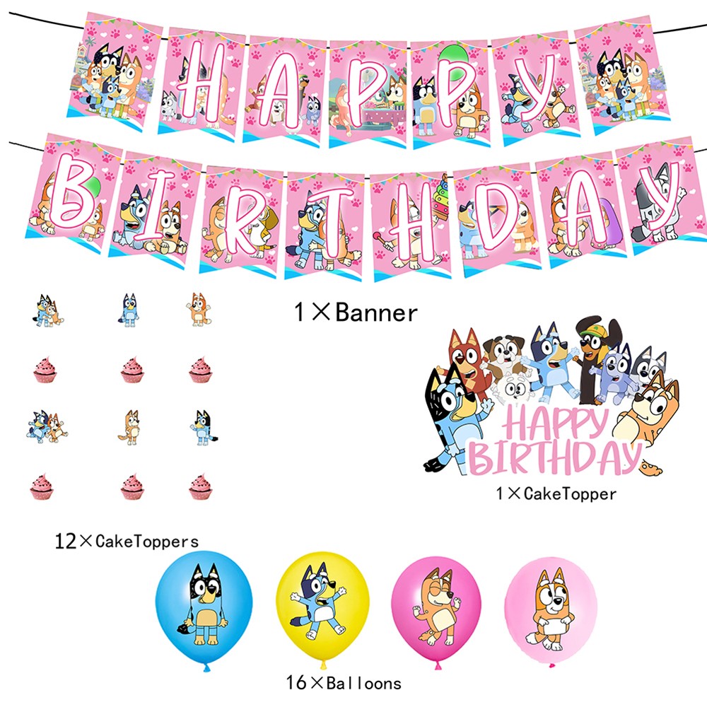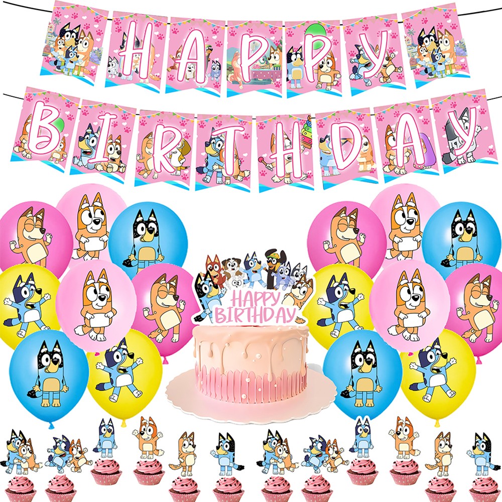 30Pc Pink Bluey Party Birthday Decoration Include a Banner Cake Toppers Balloons