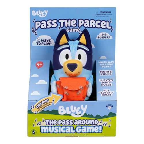 Bluey Pass the Parcel Musical Game, Soft Huggable 8" (20 cm) Bluey Plush. Three Interactive Games to Play, Incl. Hot "Botato". Fun Family Game, Party Game and Preschool Game
