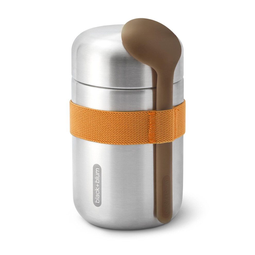 BLACK + BLUM - Food Flask - Vacuum Insulated 304 Stainless Steel Food Container with Leak Proof Lid, Nylon Strap and Natural Wood Fibre Spoon - Keeps Hot for 6 hrs, Cold for 8 hrs, Orange - 400ml