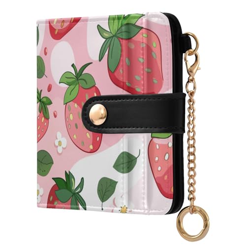 Amooorous Blush Strawberry Milk Pattern Portable Ladies Slim Foldable Wallet PU Leather Bifold Wallet for Woman Girl