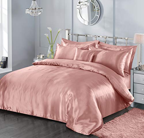7 Piece Satin Sheets Super Soft Shiny Bedding Sets, 1 x Duvet Cover, 1 x Fitted Bed Sheet, 4 x Pillow Cases, 1 x Cushion Cover, Full Complete Bed Set (Blush Pink, King)