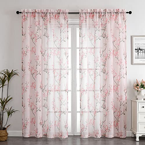 Linentalks Floral Pink Sheer Curtains 84 Inches Long, Cherry Flower Pattern Semi Sheer Blush Curtain Drapes for Living Room, Rod Pocket Window Panels for Bedroom Set of 2 Pcs