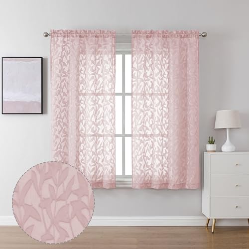 Lecloud Leia Clip Textured Sheer Blush Curtains 45 Inch Length 2 Panels, Dual Rod Pockets Window Living Room Voile Pink Curtain, Farmhouse Jacquard Leaf Gauzy Kitchen Bedroom Drapes, 38x45 Inches