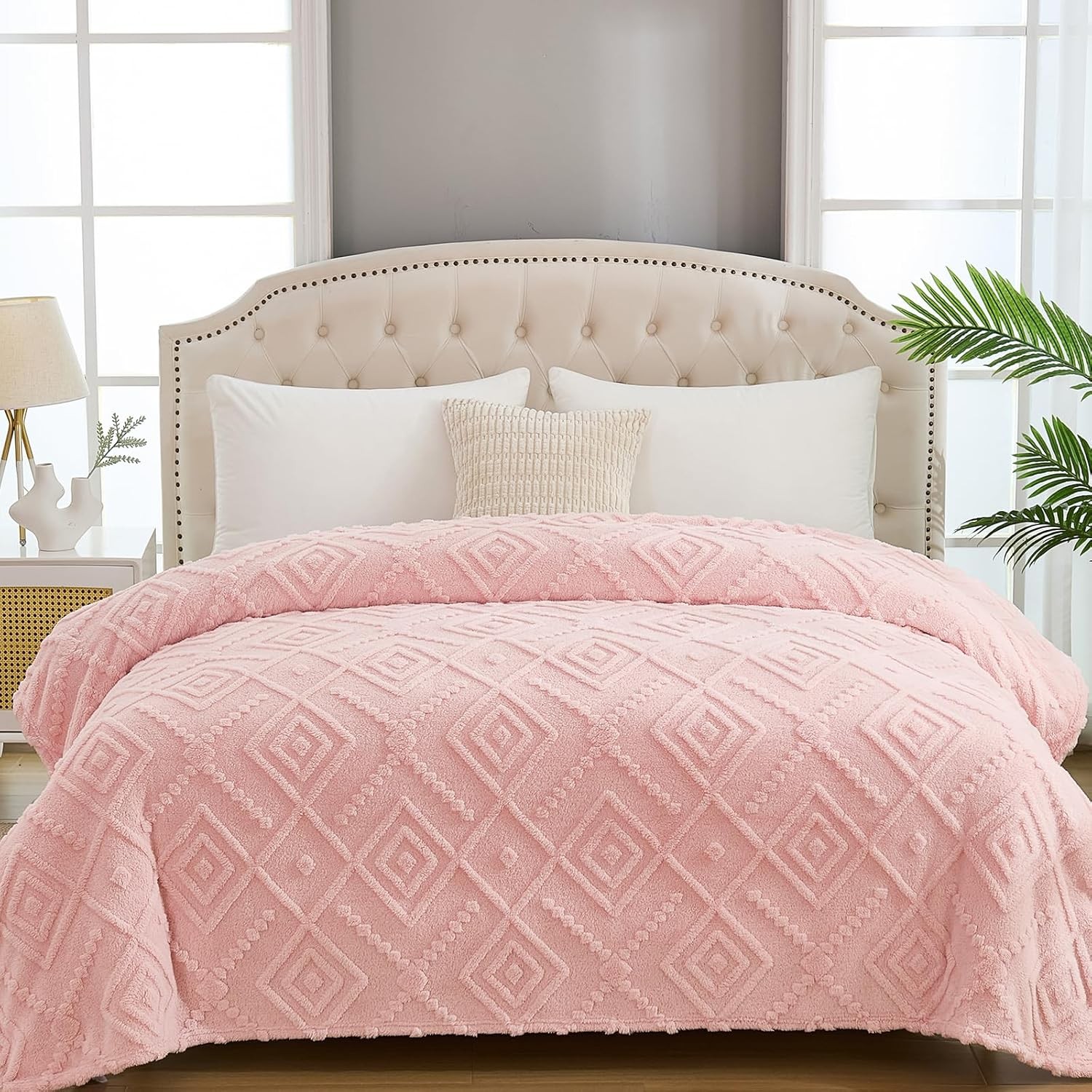 Guchuang Blush Pink Fleece Throw Blanket, Jacquard Diamond Pattern Blanket King