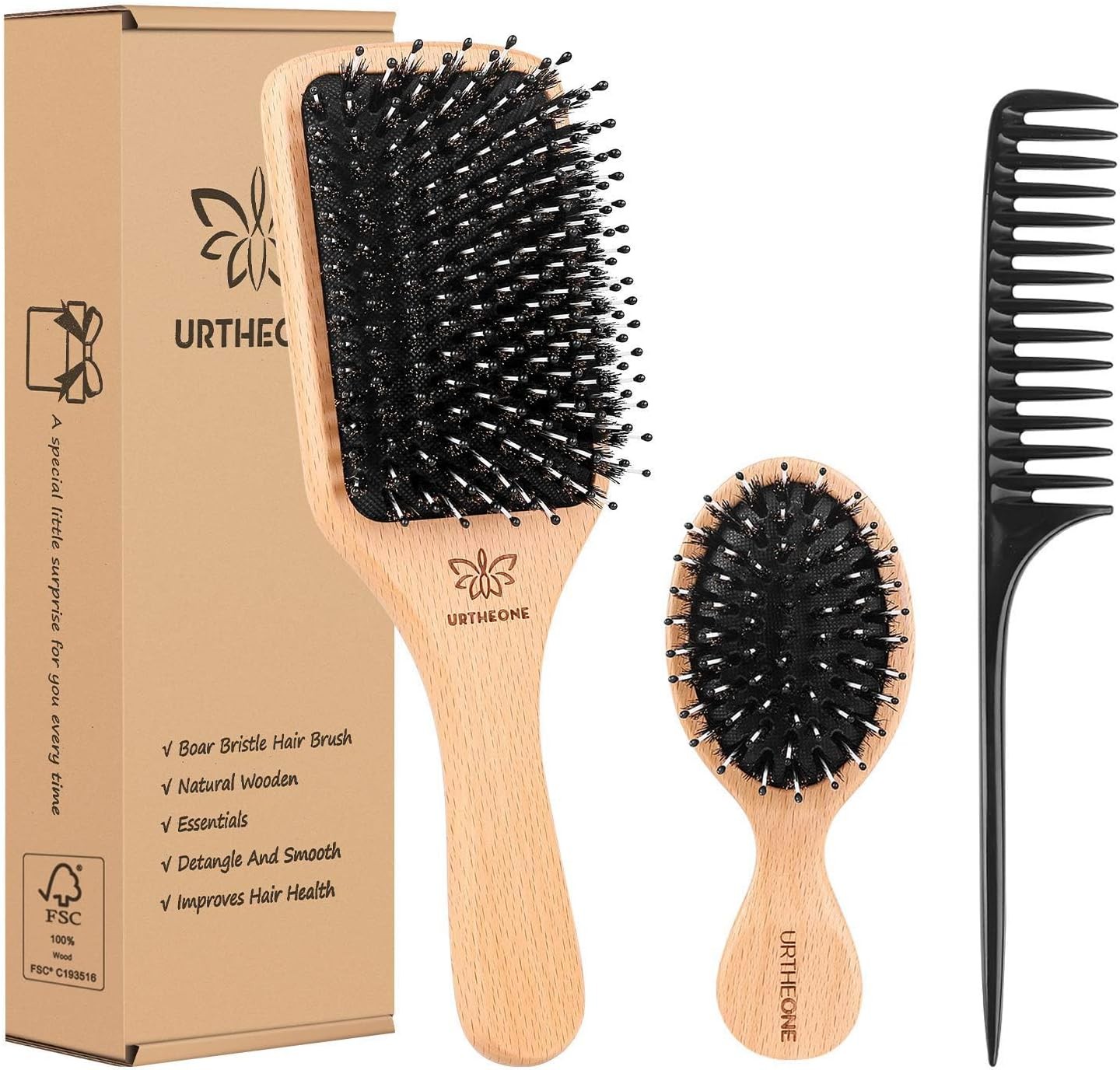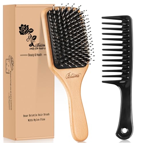 Boar Bristle Hair Brush and Comb Set for Women Men Kids, Best Natural Wooden Paddle Hairbrush and Small Travel Styling Brush for Wet or Dry Hair Detangling Smoothing Massaging