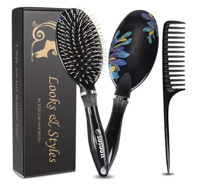 Sosoon Boar Bristle Hair Brush for Women, Men, and Kids - Thick, Curly, Dry Hair