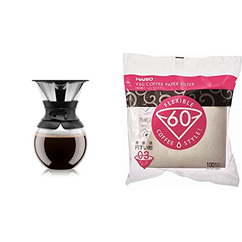 BODUM Pour Over Coffee Maker with Filter, Borosilicate Glass - 1.0 L, Black & HARIO V60 Coffee Filter Papers White 100 Sheets, Size 3-100pcs