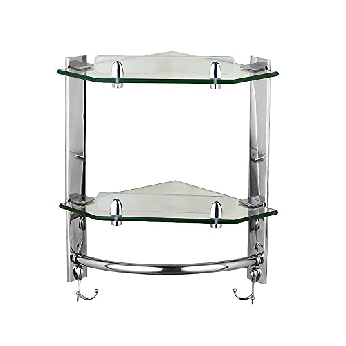 YIHANSS Kitchen Shelf Creative Bathroom Lavatory Double Glass Wall Mount Towel Bar Rustproof Stainless Steel Storage Corner Stand Shower Caddy 2 Tier Bath Organizer Holder with 4 Hooks