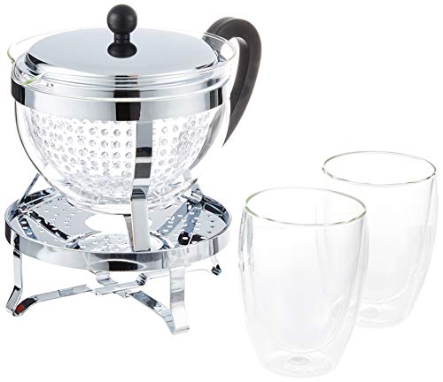 Bodum Chambord Set with Rechaud 1.5 L and 2 Pack of Double Wall Glasses Pavina 0.35 L Tea Maker, multi-layered, Black, 16.8 x 23.1 x 22.3 cm, K11143-16-1