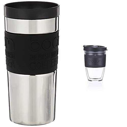 BODUM 11093-01 Screw-Top Vacuum Travel Mug, 0.35 L - Small, Black & 11889-01S JOYCUP Travel Mug, Double Wall, 0.3 l, Black Band, Plastic