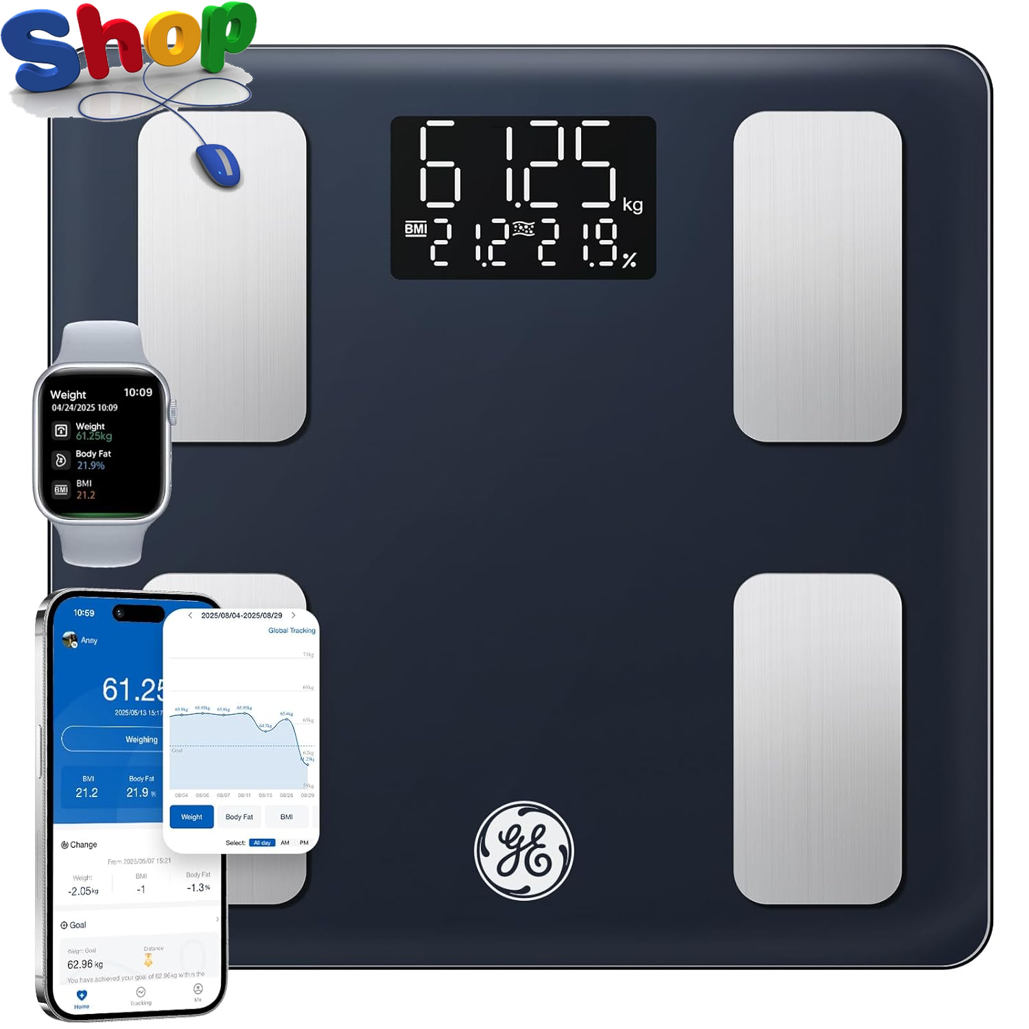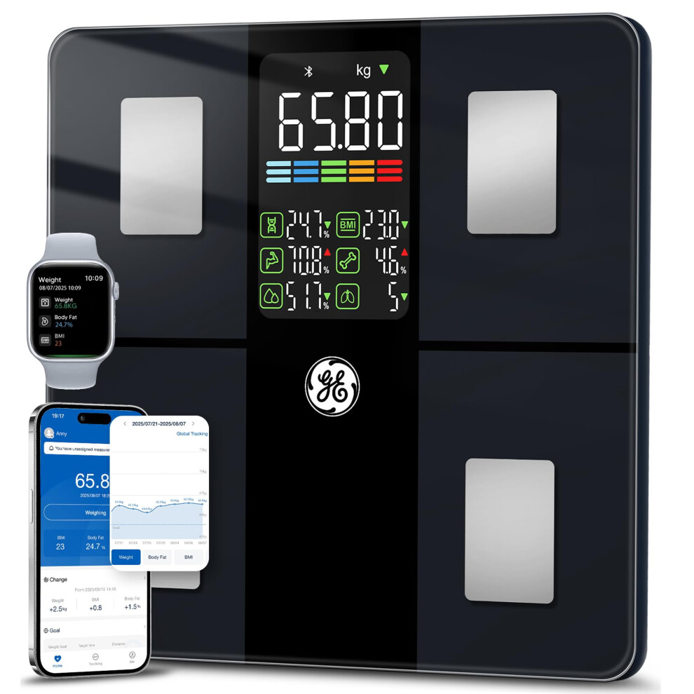 GE Smart Scale for Body Fat, Bathroom Weight Scales for BMI Muscle Mass Digital Bluetooth Electronic Body Composition Monitor for People with App Large Display, Accurate 180kg/400 Pounds Capacity