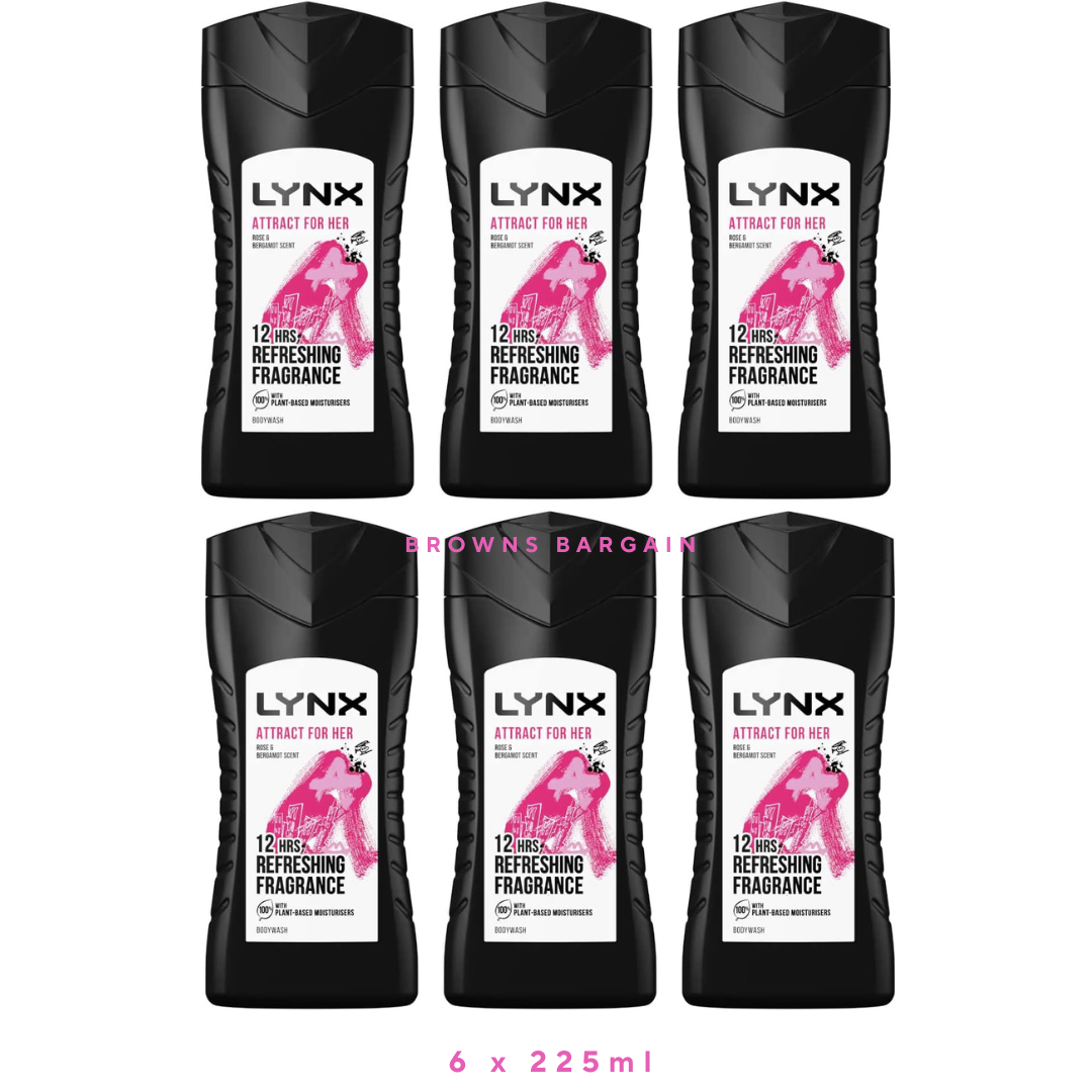 6 x Lynx Attract for Her ROSE & BERGAMOT Fragrance Bodywash Shower gel 225ml
