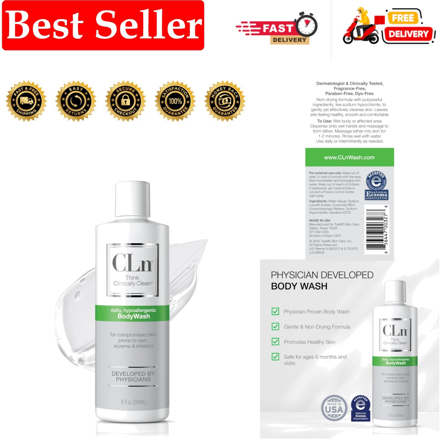 CLn BodyWash – Non-Drying Body Wash Preserved with Sodium Hypochlorite, For Compromised Skin Prone to Eczema, Dermatitis, Rash & Hidradenitis Suppurativa, Fragrance-Free & Paraben-Free, 240ml