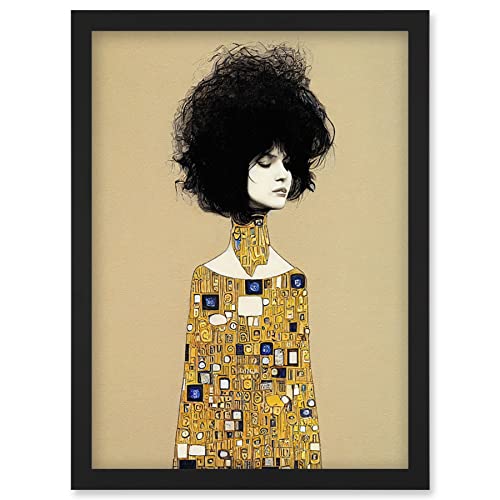 Klimt Style Retro Boho Afro Hair Abstract Gold Dress Artwork Framed Wall Art Print A4